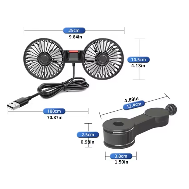 perfect product. Answers exactly to the need. Easy to use and operate. Three different strengths at the touch of a button. Each fan can benefit in a different direction separately. Very useful. worth every penny. Long USB cable for the car.